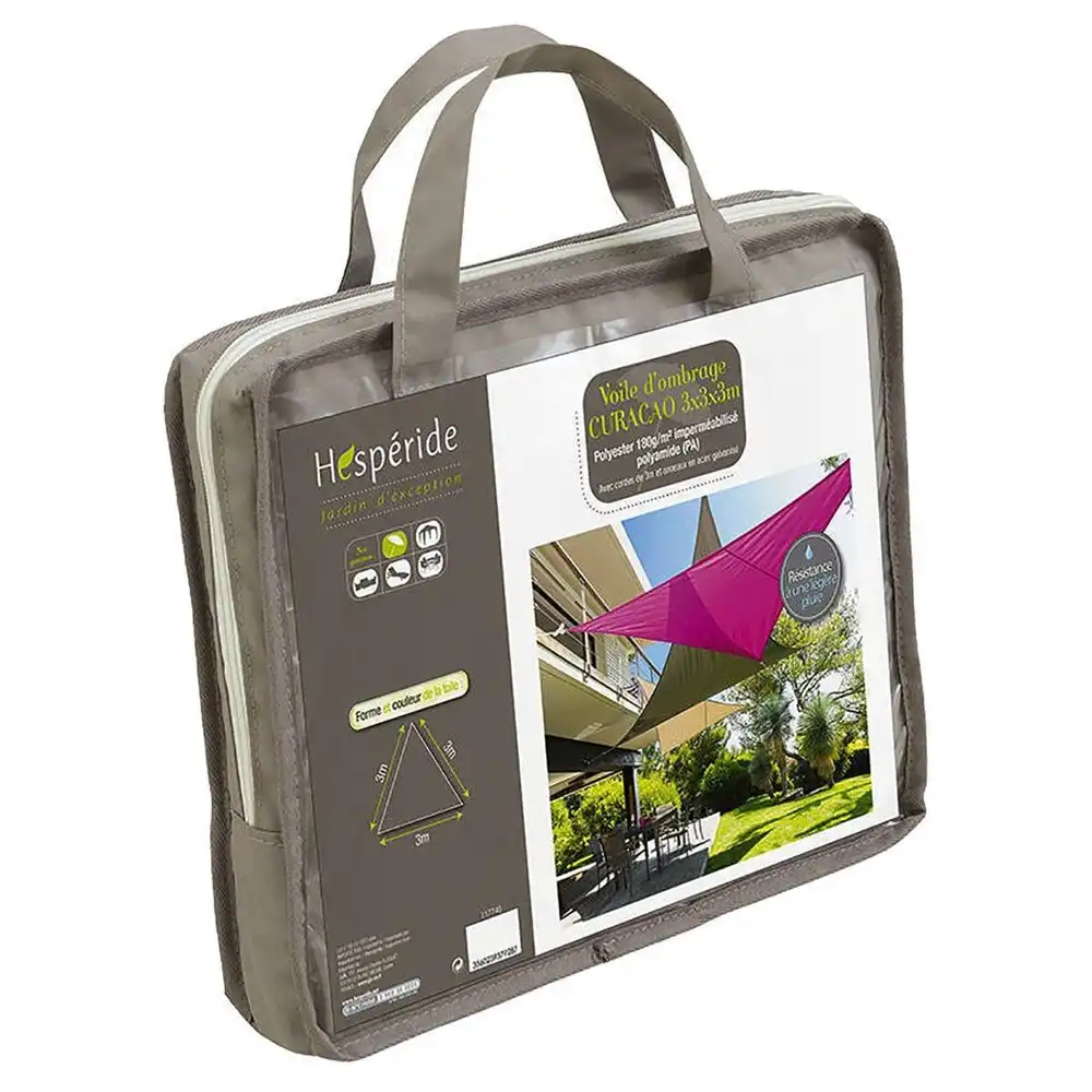 Sluneční plachta taupe (capuccino) z modelové řady Curacao o rozměru 3x3x3 metrů. Dodáváno v praktickém balení i pro možnost následného uskladnění mimo hlavní sezonu.